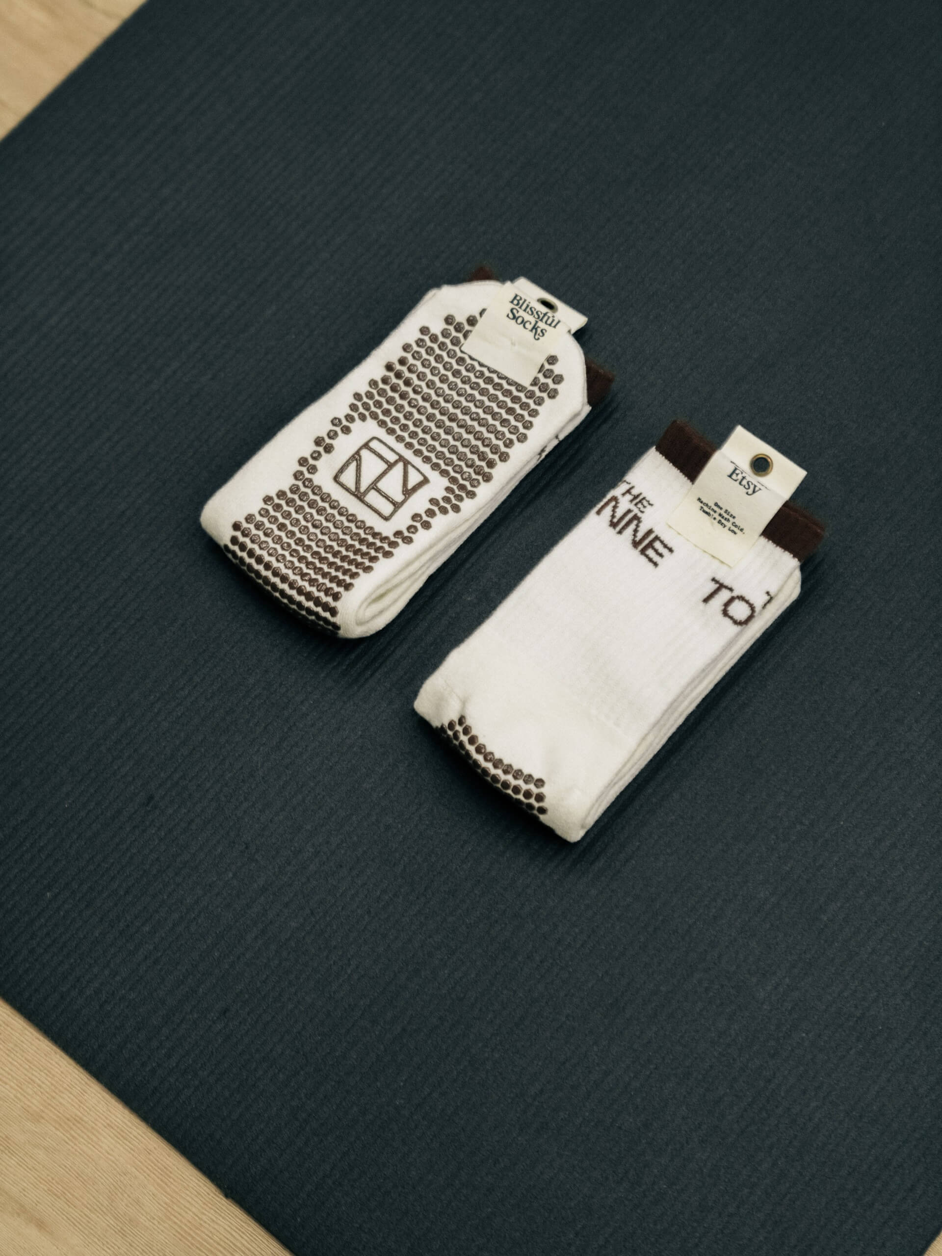 Each pair is professionally embroidered and hand-pressed with non-slip PVC grips, providing long-lasting traction that enhances stability, balance, and alignment throughout every mat-based movement. Made for both function and form—grounded in performance, refined for daily wear.